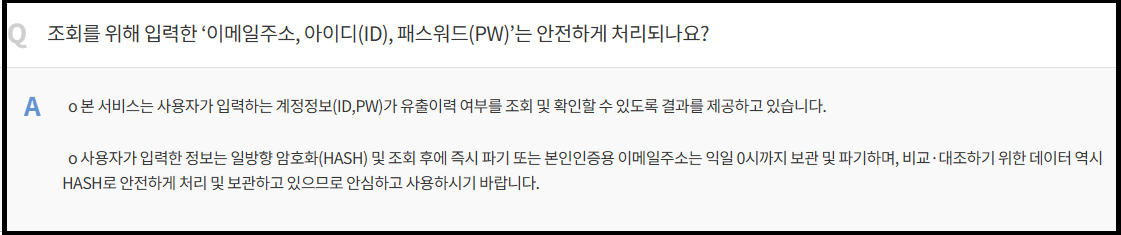 서비스는 암호화된 비밀번호 해시값까지 비교하여 유출 여부를 판단하므로, 계정 탈취 위험을 크게 줄일 수 있다.
