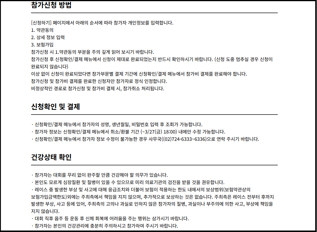 서울하프마라톤은 선착순 접수가 기본 원칙이다. 매년 접수 시작과 동시에 빠르게 마감되기 때문에 사전 준비가 중요하다. 참가자는 서울하프마라톤 공식 홈페이지에서 회원가입 후 신청할 수 있으며, 결제까지 완료해야 접수가 확정된다. 2026 서울하프마라톤 역시 온라인 접수 방식이 유지될 가능성이 높다. 참가비에는 기록 측정용 칩, 기념품, 완주 메달 등이 포함되는 경우가 많아 서울하프마라톤의 가성비는 높은 편이다.